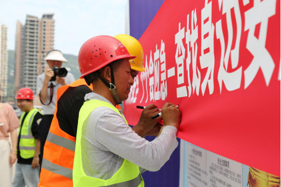 啟動儀式上,公司黨總支副書記、總經(jīng)理馮皓代表業(yè)主單位致辭,宣布安全生產(chǎn)月活動正式啟動。馮皓強調安全生產(chǎn)對項目建設的重要性,要求全體人員將安全理念貫穿工作始終,積極參與各項安全活動。并特別指出,張家河生態(tài)修復項目承載著改善區(qū)域生態(tài)環(huán)境、造福一方百姓的重要使命。作為項目業(yè)主,深知安全生產(chǎn)不僅是項目順利推進的基石、守護建設者生命安全的防線,更是踐行社會責任、保障生態(tài)修復事業(yè)高質量發(fā)展的核心要義。隨后,施工單位代表領誓,宣讀了《安全生產(chǎn)誓詞》。緊接著,參與人員在“安全生產(chǎn)月”主題橫幅上簽名,以莊重的形式明確自身安全責任。